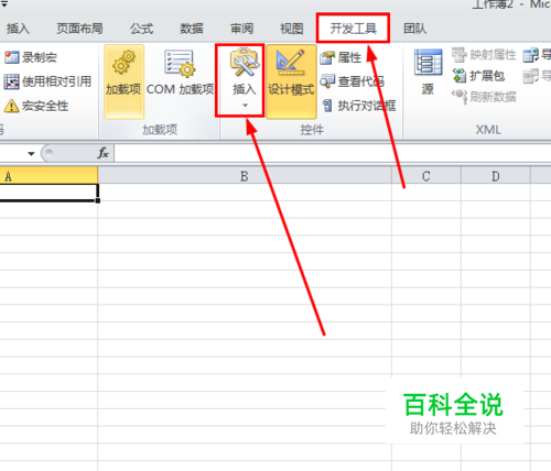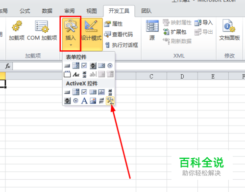 首先,打开Excel 2010,然后找到“开发工具”菜单,选择下面的“插入”子菜单。