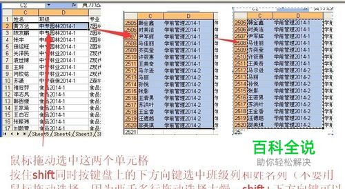 鼠标拖动选中这两个单元格 按住shift同时按键盘上的下方向键选中班级列和姓名列(不要用鼠标拖动选择,因为两千多行拖动选择太慢,shift+下方向键可以快速选择连续的同列单元格) 然后按ctrl+c复制