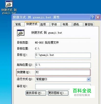 之后我们就可以在C盘找到guanji.bat这个文件,我们首先将这个文件的快捷方式发送到桌面,方法是在这个文件上右键,选择“发送到”-“桌面快捷方式”,之后在桌面上就可以找到一个名为guanji.bat快捷方式文件了,最后我们再在这个桌面快捷文件上右键选择属性,把鼠标放置在快捷键里,然后按下F2键,设置F2为关机快捷键,当然你也可以设置成F1或者其他快捷键都可以,最后确定即可,如下图: