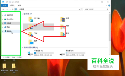 用户在"家庭组 (树项目)"上左键单击(在"此电脑"中)。
