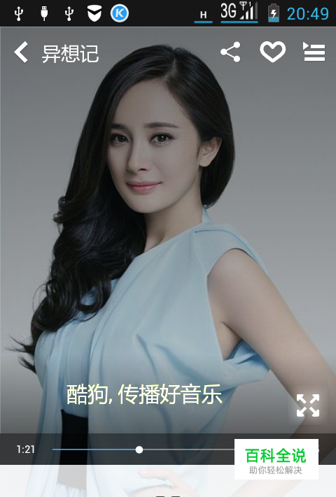 找一首杨幂的歌曲播放,酷狗会自动匹配杨幂的写真。这样的话,按说我们的手机上应该有杨幂的这张图片,却找不到在哪儿。