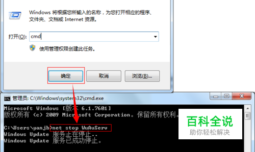 WIN+R打开运行后(也可开始菜单搜索框直接输入CMD打开运行),输入cmd回车。然后在命令行下输入:net stop WuAuServ(停止Windows自动更新服务)