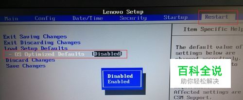 1、选择Restart标签 找到-OS Optimized Defaults 选项 按回车键 选择【Disabled】