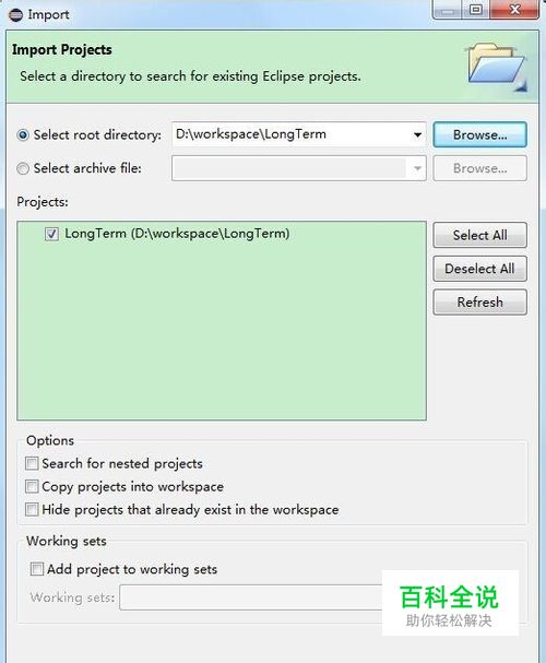 导入工程:File->Import->General->Existing Projects into Workspace;浏览工程所在位置,点击“Finish”完成导入。