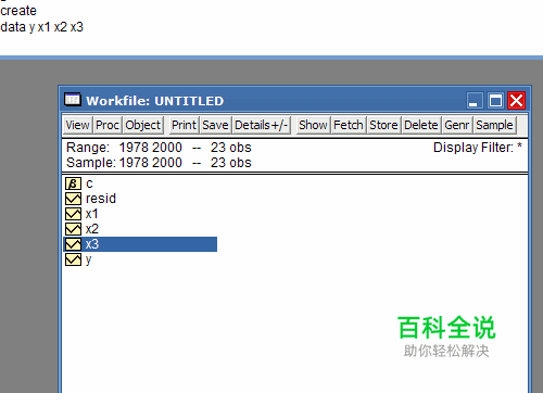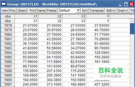 3、选择计算X1、X2、X3的简单相关系数。在工作窗口中定义这两个序列,然后单击鼠标右键,选择Open—as Group,