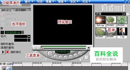打开会声会影6,我们看到软件界面非常漂亮,而且各项功能都一目了然,如图一。 我将会声会影的工作界面分为了几个区域,从图中可以明显的看出各个区域划分的情况。 界面中最上面一行是功能菜单栏,即步骤面板,这些功能选项将直接对视频文件进行处理,从左到右一次选择,它可以控制其它工作区,包括选项面板、时间轴和图库。 中间是预览视频文件的效果的区域,像一个放电影的软件界面一样,在这个区域中上面有荧幕,下面有快进、播放、快退、停止等按钮。 在这些按钮下方是工具菜单,和我们平时用的软件界面不同,一般的工具菜单是在最上方一栏,就是会声会影步骤面板那一行。会声会影的工具菜单却放在软件界面的正中间,第一个工具就是帮助文件,然后依次是撤销、重复、问号帮助、垃圾桶、存盘等选项。 最右边是存放素材的地方,图库中可以包含视频文件、影像(图片)文件,色彩脚本,需要处理的脚本都放在这里的。旁边有一个打开文件的图标,外部脚本可以从这里导入到软件中等待处理。 在整个软件界面的最下面是文件编辑区,即时间轴,在这里有多个轨道,分别可以放入需要处理的脚本、复叠的脚本、标题、音乐、旁白等等,然后在对其中的素材进行剪辑、编辑。 工作界面简单介绍到这里,由于我使用的是会声会影繁体试用版,有些功能的命名和简体版可能有出入,本篇文章将采用前面统一命名的名称。下面我们仔细看看每个功能选项的具体功效。