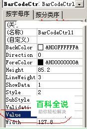 ②:设置条形码的样式 若要修改默认条形码的样式、条形码线条的宽度以及颜色等内容,我们可以右键点击插入的条形码,从弹出的菜单中依次选择“Microsoft Barcode Control 9.0对象→属性”命令,在接着出现的“属性设置”界面中进行相应的设置即可。 ③:设置条形码数字 若要修改条形码下端的数字,可右击插入的条形码,选择“属性”命令,此时出现“条形码属性”界面(如下图),在Value值中输入我们需要的条形码数字,此时看到的条形码数字并未更改,甚至预览时也看不到修改的结果,此时不要着急,先将文档保存后退出,再次打开该文档时即可看到修改后的结果。