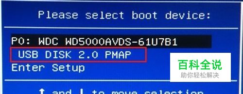 按下ESC后,系统将进入到启动项选择界面,我们利用键盘上的方向键选定我们的u盘,小编的u盘显示的是“USB DISK 2.0 PMAP”,如下图所示: