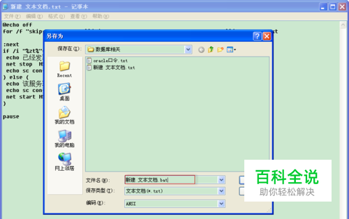 将下面文本复制到txt中。 @echo off for /f "skip=3 tokens=4" %%i in ('sc query MSSQLSERVER') do set "zt=%%i" &goto :next :next if /i "%zt%"=="RUNNING" ( echo 已经发现该服务在运行,开始停止 net stop MSSQLSERVER echo sc config MSSQLSERVER start = DISABLED 禁用服务 ) else ( echo 该服务现在处理停止状态,开始启动 echo sc config MSSQLSERVER start = Manual 设置服务手动 net start MSSQLSERVER ) pause