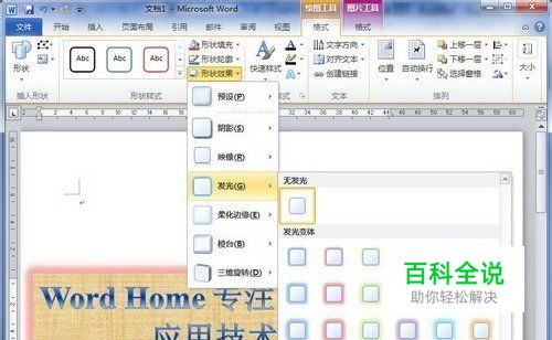 第1步,打开Word2010文档窗口,单击准备设置发光效果的艺术字,使其处于编辑状态。 第2步,在“绘图工具/格式”功能区中,单击“形状样式”分组中的“形状效果”按钮。 单击“形状效果”按钮 第3步,打开形状效果菜单,指向“发光”选项。在发光效果列表中将鼠标指向“发光变体”分组中的任意一种发光效果,则Word2010文档中的艺术字将实时显示最终效果。确认选用某一种发光效果后单击该效果即可。 选择合适的发光效果 办公软件教程 发光效果列表中的发光颜色比较有限,用户可以在发光效果列表中指向“其他亮色”选项,在打开的颜色面板选择更丰富的光线颜色。 选择更丰富的发光颜色 如果用户需要对发光效果进行更详细的设置,则可以选择发光效果列表中的“发光选项”命令。 选择“发光选项”命令 打开“设置图片格式”对话框,在“发光和柔化边缘”选项卡中,用户可以对发光颜色、发光大小、透明度和柔滑边缘等参数进行设置,以实现更加符合实际需要的发光效果。 “发光和柔化边缘”选项卡