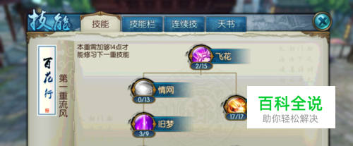 第一重,,, 1.飞花 过度的,前期可点高点挂机,后期PK1点 2.忘忧 满基本没啥说的 3.旧梦,主要是配合第一重天书减防御百分之40,顺便减个增益BUUF不要指望它打输出,建议点的不要太高1到2点OK,小编主要是后面还洗,等级不高,其他技能没法点所以点的高
