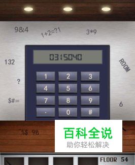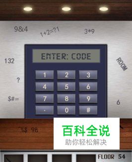 100层电梯游戏第五十四关,看起来非常复杂,其实非常简单。电梯门有点类似于计算器的面板,有0-9的数字和横条显示屏。在电梯门的墙边和地上有许多乱七八糟的字符,其实只要记住右下角的A=01就可以了。在横条显示屏上写着:ENTER:CODE(输入:代码)。