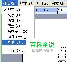 要想对Word公式中的文字变成斜体、加粗,你得使用如下的方法。 首先,进入公式的文字的输入修改状态。 然后,选择公式中的要修改属性的文字,然后,如下图一样,执行菜单“样式”→“其它”。