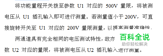 相位伏安表是一种具有多种电量测量功能的便携式仪表。该表最大特点是可以测量两路电压之间、两路电流之间及电压与电流之间的相位和工频频率。 按下 ON-OFF 按钮,旋转功能量程开关正确选择测试参数及量限。 1.测量交流电压 2.测量交流电流 3.测量两电压之间的相位角注意: 测相时电压输入插孔旁边符号U1、U2及钳形电流互感器红色“ * ”符号为相位同名端。 4、测量两电流之间的相位角 5、测量电压与电流之间的相位角 将电压从U1输入,用I2测量钳将电流从 I2 输入,开关旋转至参数U1I2 位置,测量电流滞后电压的角度。测试过程中可随时顺时针旋转开关至参数 I2 各量限测量电流,或逆时针旋转开关至参数 U1 各量限测量电压。 也可将电压从 U2 输入,用I1测量钳将电流从 I1 输入,开关旋转至参数 I1U2 位置,测量电压滞后电流的角度。同样测量过程中可随时旋转开关,测量 I1 或 U2 之值。 6、三相三线配电系统相序判别 旋转开关置U1U2位置。将三相三线系统的A相接入U1插孔,B相同时接入与U1对应的±插孔及与U2对应的±插孔,C相接入U2插孔。若此时测得相位值为300°左右,则被测系统为正相序;若测得相位为60°左右,则被测系统为负相序。 换一种测量方式,将A相接入U1插孔,B相同时接入与U1对应的±插孔及U2插孔,C相接入与U2对应的±插孔。这时若测得的相位值为120°,则为正相序;若测得的相位值为240°,则为负相序。 7、三相四线系统相序判别 旋转开关置U1U2位置。将A相接U1插孔,B相接U2插孔,零线同时接入两输入回路的±插孔。若相位显示为120°左右,则为正相序;若相位显示为240°左右,则为负相序。 8、感性、容性负载判别
