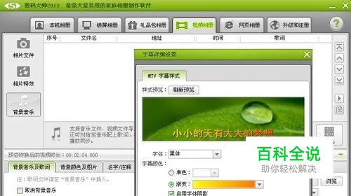 导入动听的结婚纪念歌曲,以及制作MTV动感歌词字幕 点击“背景音乐”选项卡处的“添加媒体文件”按钮,即可快速的导入动听悠扬的背景音乐,点击“插入歌词”按钮,插入LRC格式的歌词,为视频制作MTV的动感字幕。