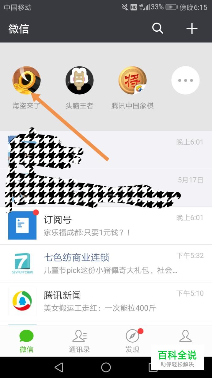 首先打开海盗来了,如果你玩过,可以直接在微信聊天界面往下拉就出现了,如下图。