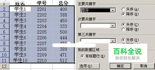 ②:如上图,首先选择总分的第二个单元格,即总分值为400的C2单元格,之后执行这样的操作:“数据”→“排序”;弹出排序对话框,之后在“主要关键字”那里选择“总分”并选择“降序”,最后按确定!之后就实现了总分的排名;