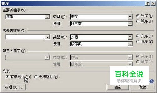 第2步,打开“排序”对话框,在“列表”区域选中“有标题行”单选框。如果选中“无标题行”单选框,则Word表格中的标题也会参与排序,如图所示。