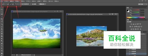 打开另一张图片,我们这里预计把右边图片的山川放到第一张图片中。 先用快速选择工具选中上下蓝天部分,再仔细选择不需要的部分。 注意可以调节快速选择工具的大小,方式。