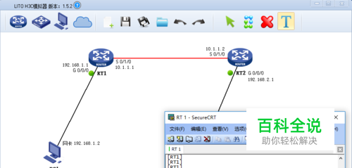 在[RT2]提示符下输入命令"ip route-static 192.168.1.1 30 10.1.1.1",为网络连通配置路由。