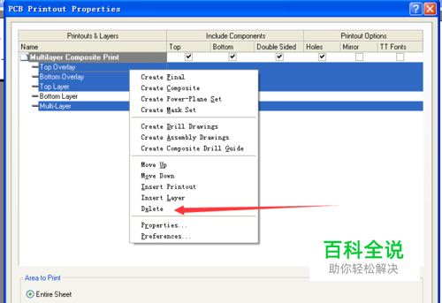 于是见到这个页面,将Holes(孔)下面的方框勾选,然后将多余的层删除掉,只留下Top Layer(顶层)或者Bottom Layer(底层)个人习惯留底层,关闭页面回到打印预览