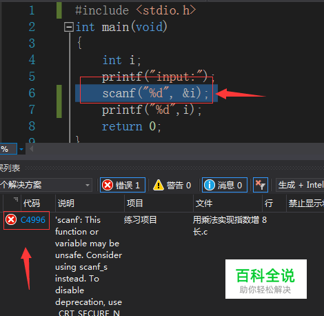 Microsoft Visual Studio简称VS。VS是一个基本完整的开发工具集,包含了许多与编程有关的工具。如果你使用过VC6.0,那么对基本输入函数scanf()一定不会陌生。但是在VS的环境下scanf直接使用会在生成解决方案时产生C4996错误,下面介绍三种解决方案。