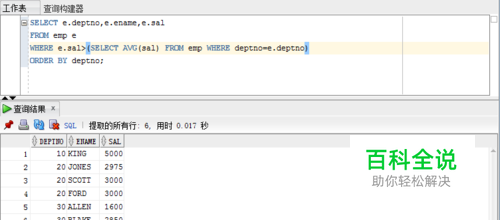 单行子查询中有分组函数,要求分组函数返回的是单行数据。如下图为查询出薪水比本部门平均薪水高的员工信息: