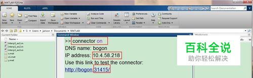 先打开matlab PC版,在command window中输入connector on(如图方框),接下来记下ip地址(第二方框)和第三方框的数字。