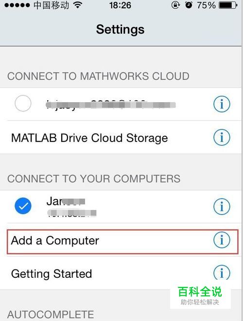 打开mobile matlab,找到setting项,选择add a computer。