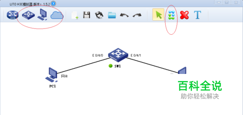 拖动一台交换机、两台计算机到工作区,点击工具栏"连线"图标建立拓扑。