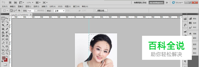 当你在辅助线边上进行选区时。就会自动的吸附到参考线上去。如图所示。