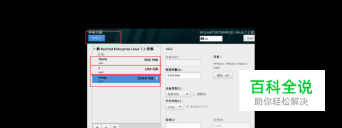 5.选择安装位置,并划好分区,一般选择如图所示的三个分区【swap、/、/boot】就OK了。如图