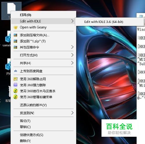 方法二: 将.py导出后用TXT打开,代码如下: Windows Registry Editor Version 5.00 [HKEY_CLASSES_ROOT\Python.File] [HKEY_CLASSES_ROOT\Python.File\Shell] [HKEY_CLASSES_ROOT\Python.File\Shell\editwithidle]"MUIVerb"="&Edit with IDLE""Subcommands"="" [HKEY_CLASSES_ROOT\Python.File\Shell\editwithidle\shell] [HKEY_CLASSES_ROOT\Python.File\Shell\editwithidle\shell\edit36]"MUIVerb"="Edit with IDLE 3.6 (64-bit)" [HKEY_CLASSES_ROOT\Python.File\Shell\editwithidle\shell\edit36\command]@="\"C:\\Program Files\\Python36\\pythonw.exe\" -m idlelib \"%L\" %*"