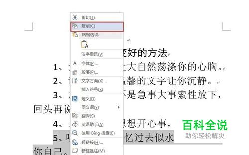例如选择一段文字,然后右击选择“复制”。当然可以使用Ctrl+C来复制。