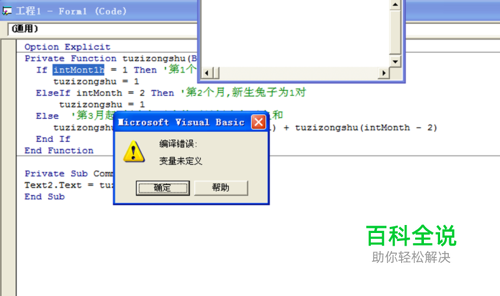 在代码区域输入代码内容Text2.Text = tuzizongshu(Text1.Text),接着重新选择对象为通用,输入自定义函数 Private Function tuzizongshu(ByVal intMonth As Integer) As Integer If intMonth = 1 Then '第1个月,新生兔子为1对 tuzizongshu = 1 ElseIf intMonth = 2 Then '第2个月,新生兔子为1对 tuzizongshu = 1 Else '第3月起,新生兔子为前两月新生兔子之和 tuzizongshu = tuzizongshu(intMonth - 1) + tuzizongshu(intMonth - 2) End If End Function