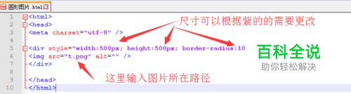 新建页面,输入内容: <html> <head> <meta charset="utf-8" /> <div style="width:500px; height:500px; border-radius:100%; overflow:hidden;"> <img src="t.png" alt="只是圆形图片" /> </div> </head> </html>