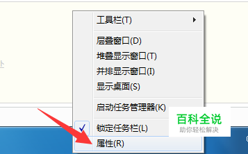打开桌面鼠标指针定位到任务栏,右击任务栏属性。