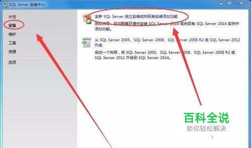 在安装中心的左侧选择安装,右侧选择全新SQL Server独立安装或向现有安装添加功能选项。