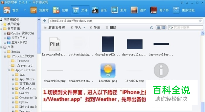 iOS6 iOS6.1完美越狱后,天气闪退修复教程 iOS6完美越狱后,大家都遇到了“天气应用”会闪退的现象,怎么办呢?1、请先运行同步助手,切换到文件界面,进入“iPhone上的文件/Applications/Weather.app”找到Weather文件,导出备份下以防万一。 2、然后下载Weather.zip,解压,将里面的文件拖曳至上述路径中,替换Weather文件,就能正常运行天气应用。如果不行的话,请重启设备。