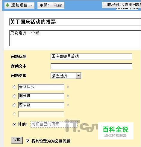 打开网页“http://docs.google.com”并进行登陆,登陆后点击菜单“新建—Form”,在显示的页面中就可以来设置投票的内容了,按提示输入标题和说明,在问题类型中选择“多重选择”(如果是多重选择的投票,那可以选择“复选框”),接着就可以在下面来设置投票的选项了,点击最后的半透明选项可以动增加,如果点击“添加其他”链接,那可以让投票者输入自己的投票内容,全部设置好后点击“完成”按钮,再点击页面右上角的“保存”按钮来保存这个投票表单(如图1)。