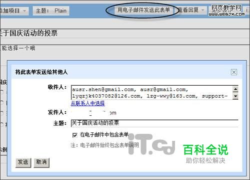 投票编辑好了,这时我们就可以用它发送给需要投票的网友了,点击导航上的“用电子邮件发送此表单”按钮,这时就会弹出一个发送面板,在“收件人”栏中输入网友们的邮箱地址,完成后点“发送”按钮就可以了(如图2)。