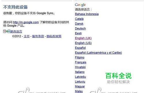 2. 浏览器地址栏输入 m.google.com/sync如果出现不支持你手机设备 ,你就点击页面的更改语言修改为 English(UK)