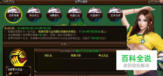 4年一届的世界杯又开启了,这无疑是在平淡的生活中加入了一剂兴奋剂,走到哪里都能听到对于世界杯的激励讨论,无论是高富帅还是屌丝们纷纷按捺不住心中的骚动!为何要低调呢?在8090游戏烈火战神中,世界杯的热情已被点燃,快来参加世界杯冠军竞猜活动吧! 最热活动:冠军竞猜 巴西世界杯冠军大猜想,是巴西、德国,还是意大利?亦或是……在8090游戏烈火战神中押上你心目中最牛逼的球队,大力神保佑你拿走海量元宝大奖! 活动时间:2014年6月13日—2014年7月15日 活动详情:活动期间,点击“我要竞猜”,可以进行冠军竞猜元宝投注,于7月7日0点竞猜投注截止。每个玩家最多可竞猜8支球队,但同一球队可竞猜多次。竞猜时有一定几率获得奖励,奖励邮件发放。 竞猜投注元宝数量根据时间变化: 小组赛第一轮6.13-6.18,每次投注20元宝 小组赛第二轮6.19-6.23,每次投注40元宝 小组赛第三轮6.24-6.27,每次投注60元宝 16强6.28-7.2,每次投注120元宝 8强7.3-7.6,每次投注240元宝 8090游戏烈火战神的世界杯冠军竞猜活动越到后期进行投资,获得额外奖励的几率越大,奖励也越好。当世界杯冠军产生后,所有猜中冠军的玩家平分奖金池所有奖金。还在观望和等待吗?让自己用实际行动来支持烈火战神,支持世界杯吧!