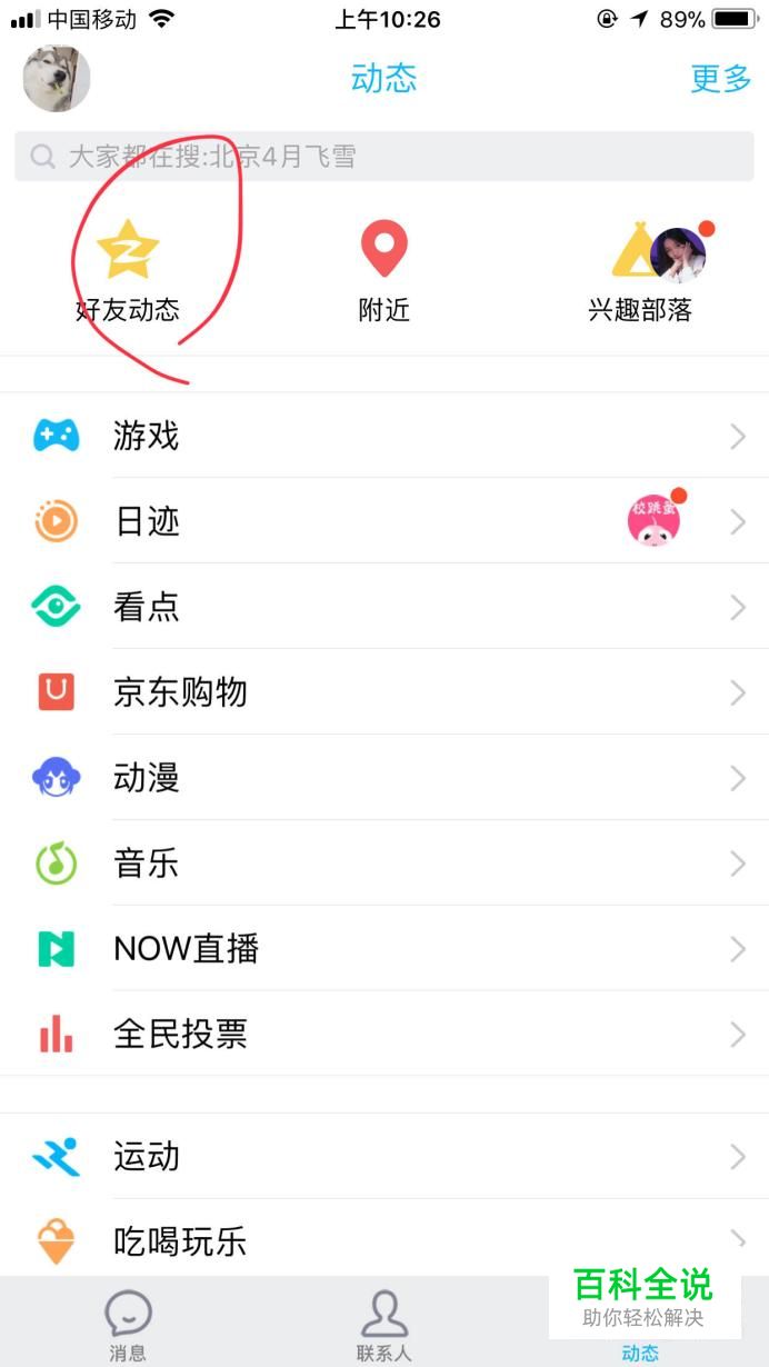 进入动态页面后,如图所示,点击左上角的好友动态,进入空间。