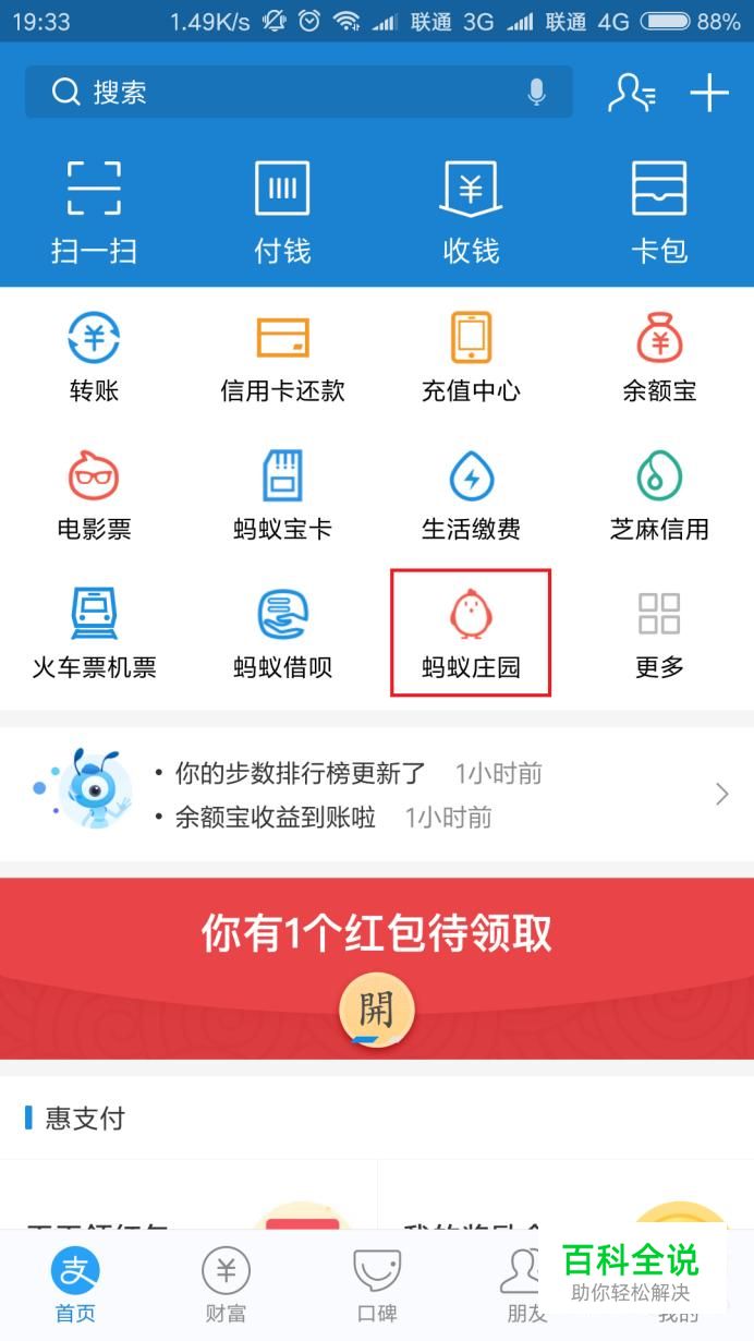 首先,打开支付宝应用主页面,点击页面中的“蚂蚁庄园”菜单选项。