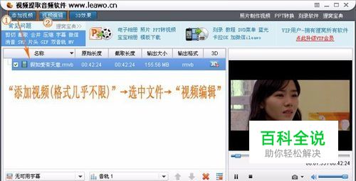 废话少说,直切主题。打开提取视频中的音乐软件,如下图所示,操作其实很简单,先“添加视频”把需要提取音频的视频文件载入,视频格式几乎是不限的,然后选中列表区中的文件,再单击“视频编辑”。