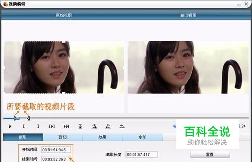 随后进入视频编辑窗口,如下图,时间轴上有左区间和右区间浮标,鼠标拖动以选定截取视频片段(左、右区间之间的部分)。或在“视频截取”选项下可以精确设置“开始时间”和“结束时间”,精确度为0.001秒。设置好后,点击“确定”。