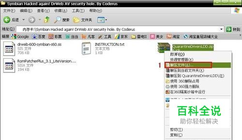 鼠标右击上面的QuarantineDriversLDD.zip ,然后选择解压到内存卡中,(手机内存卡模式连接电脑)。这里要注意必须解压到内存卡根目录(就是刚刚进入内存卡的目录),解压到其他文件夹肯定失败,手机端解压也肯定失败!