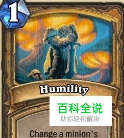 谦逊(Humility) 使一个随从的攻击力变为1。 Change a minion's Attack to 1. 类型(Type) : 技能(Ability) 品质(Rarity): 普通(Common) 卡组(Set) : 基本(Basic) 职业(Class) : 圣骑士(Paladin) 原画(Artist): 达兰·巴德(Daren Bader) 这张牌真是会让人的心情很糟糕,就像潮湿阴冷的天气。 谦逊与《炉石传说》 谦逊消耗1点法力水晶,效果为使一个随从的攻击力变为1。印象中,能达到类似效果的只有法师的变形术和萨满的妖术。变形术消耗4点水晶,将一个仆从变成1 血1攻的绵羊,谦逊虽然只需要1点消耗,但无法将仆从的血量降低,效果可谓致残而不致死。这个技能的使用首先选择的对象是血低攻高的对象,以我方仆从1血的低成本代价消灭对方的主力仆从。再其次是针对高血高攻的仆从,即使无法消灭这个仆从,也可让该仆从报废。但该技能不推荐用于留在场上即可发挥特效的仆从和带有嘲讽技能的高血仆从。在游戏的使用时机上,越是游戏后期阶段,高攻的敌方仆从卡出现的几率越大,谦逊发挥的效能也越大。 This card makes something really damp. Oh wait. That's "Humidity".