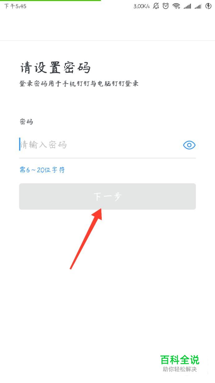 点击“下一步”之后进入钉钉隐私政策的页面,然后点击右下角“同意”,之后进入下一个页面设置你自己的密码,密码需要6~20位字符,输入完之后点击“下一步”。